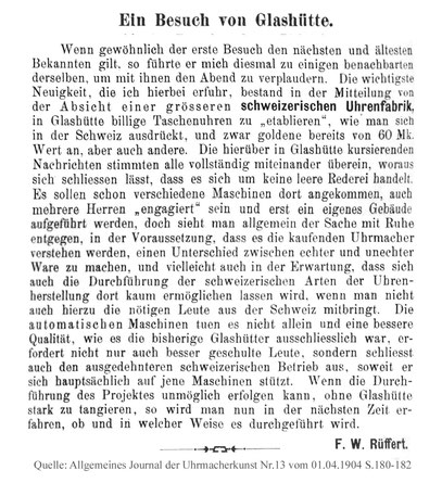 Aus nachfolgenden Veröffentlichungen geht eindeutig hervor, dass sich die Union horlogère nach dem zu Jahresbeginn 1904 erfolgten Austritt ihres einzigen Glashütter Mitgliedes, der renommierten Firma „J. Assmann“, und dem damit verbundenen erheblichen Verlust an Einfluss auf dem deutschen Markt mit der „Glashütter Präzisions-Uhren-Fabrik Akt. Ges.“ der Gebrüder Loeske Mitte des gleichen Jahres umgehend ein neues „Standbein“ in Glashütte geschaffen hatte.