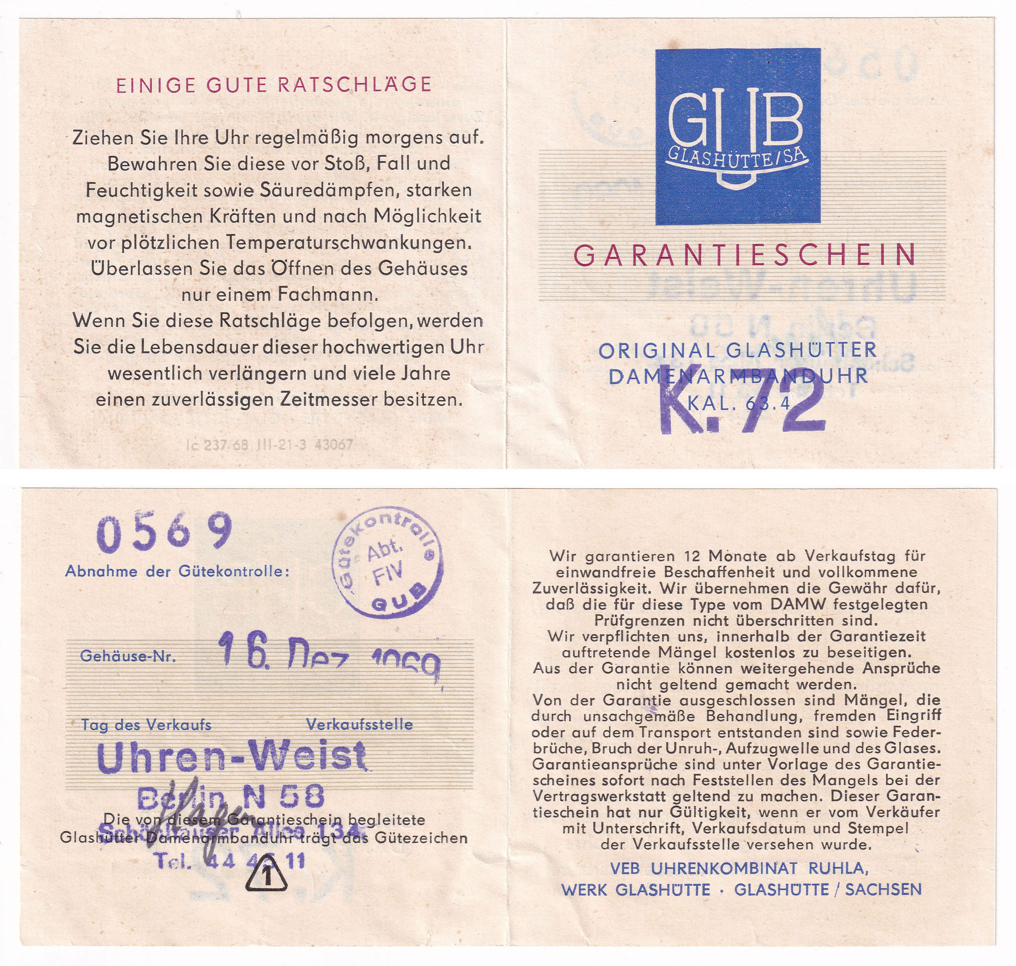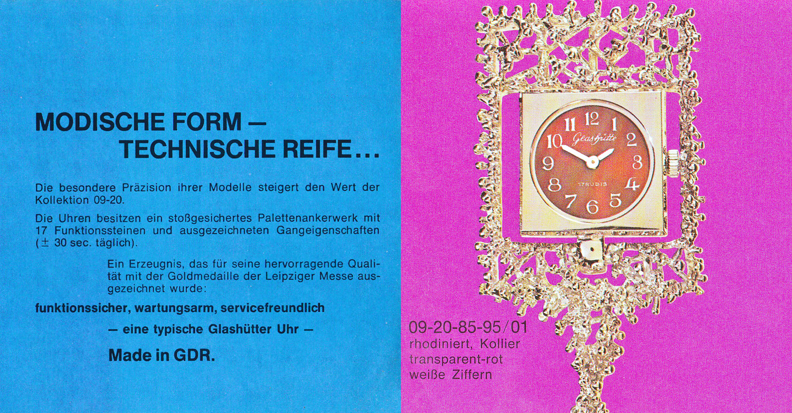 Als modisches Accessoire wurden bereits in der zweiten Hälfte der 1950er Jahren vereinzelt Modelle von Kollieruhren vom VEB Glashütter Uhrenbetriebe mit dem mechanischen GUB-Armbanduhrwerk Kaliber 63 gefertigt. In den 1960er Jahren folgten Modelle mit den GUB Damenarmbanduhrkaliber 63.4. Zu Beginn der 1970er Jahre kamen solche Uhren immer mehr in Mode und der VEB Uhrenwerk Glashütte im Uhrenkombinat Ruhla stellte sich mit der Fertigung von verschiedenen Modellen darauf ein. Als Uhrwerke kamen die GUB-Armbanduhrkaliber 08-20 und 09-20 zum Einsatz.
