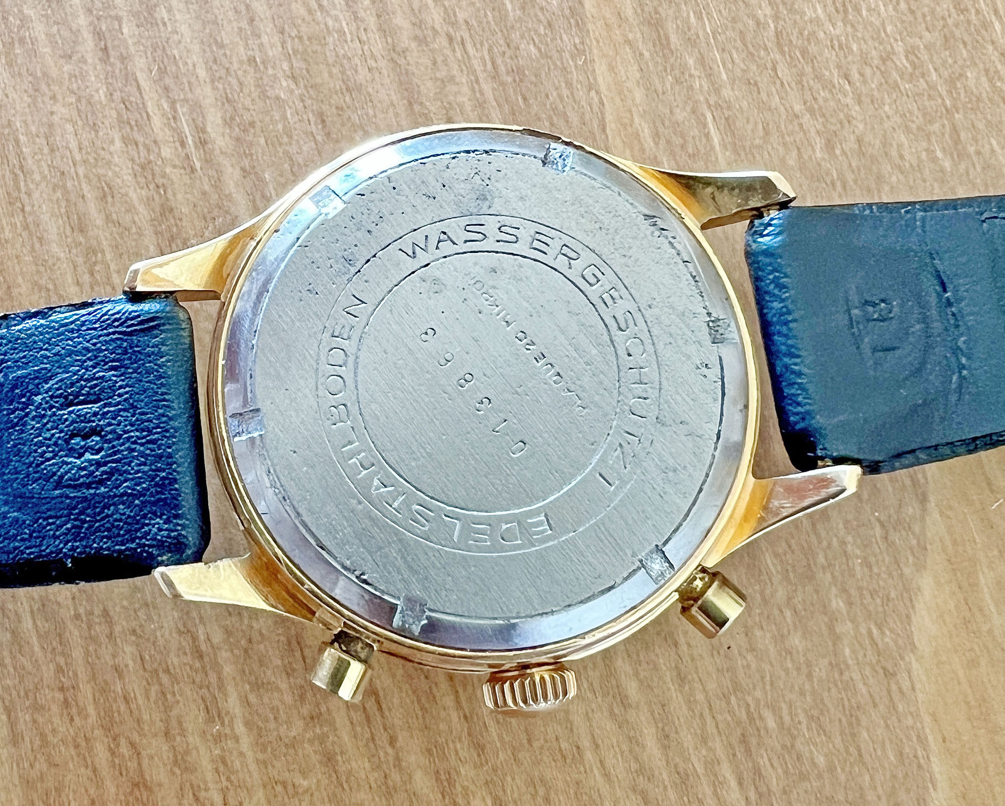 1954 brachte der VEB Glashütter Uhrenbetriebe mit dem Chronographenkaliber 64 eine verkleinerte Version des bis 1945 von der UROFA & UFAG gefertigten Fliegerchronographen Kaliber 59 als zivilen Armbanduhrchronographen auf den Markt. In den sieben Jahren der Fertigung wurden verschiedene Gehäuse und Zifferblattvarianten verwendet. Bei dem hier vorgestellten Chronographen handelt es sich mit der Werknummer 11382 um ein frühes Exemplar. Die damalige Katologbeschreibung lautete: Nr.664/3, Gehäuse Plaqué 20 Mikron, Edelstahlboden, wassergeschützt. Interessant sind bei dieser Ausführung das Gehäuse mit langen Bandanstößen, die kleinen Drücker und die Gestaltung des schwarze Zifferblattes mit aufgesetzten Stundenzahlen und gegenüber späteren Versionen zwei kleineren Hilfszifferblättern. Es handelt sich aufgrund der in dieser Version geringen Fertigungszahl schon um ein interessantes Sammlerobjekt.