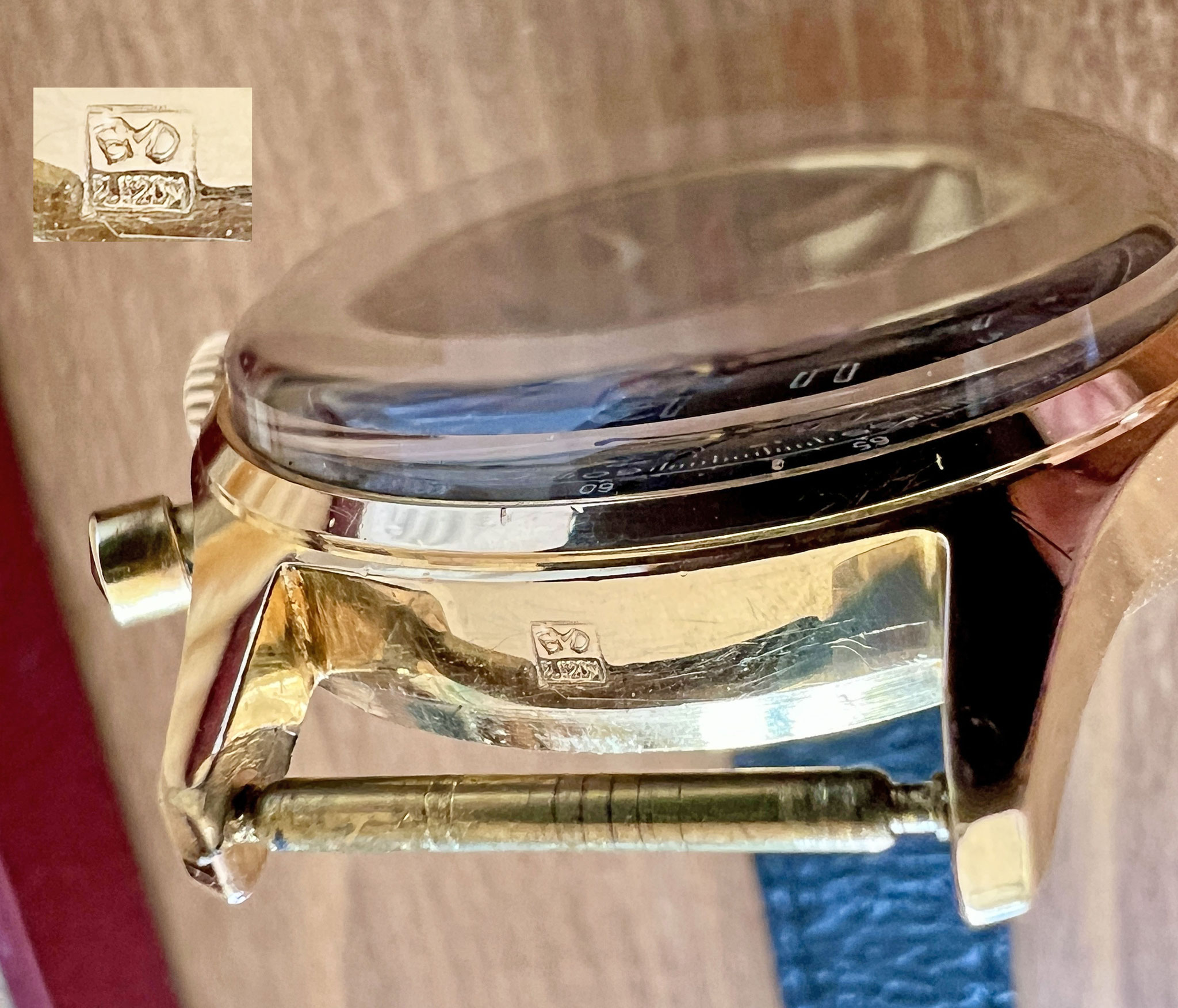 Mit der Werknummer 17957 handelt es sich bei diesem Schaltrad-Chronographen aus der Fertigung des VEB Glashütter Uhrenbetriebe um ein relativ spätes Exemplar um 1958. Nur noch sehr selten findet man das weiße Originalzifferblatt in diesem noch relativ guten Zustand. Da das GUB Kaliber 64 eine Verkleinerung des Schaltrad-Chronographenwerkes der UROFA Kaliber 59 darstellt, welches von der UFAG und weiteren Remontagewerkstätten von 1941 bis 1945 gefertigt worden war, stellt es keine Neuentwicklung dar. Die Verkleinerung des Werkes auf 28mm bedeutete einen erhöhten Fertigungsaufwand und brachte auch hinsichtlich der Qualitätssicherung nicht unerhebliche Probleme mit sich. Entgegen früherer Veröffentlichungen (z.B. K. Herkner; Glashütter Armbanduhren S.167) wurde dieser GUB Armbanduhrstopper nachweislich weder für militärische Zwecke konzipiert noch von den bewaffneten Organen der DDR dafür zum Einsatz gebracht.