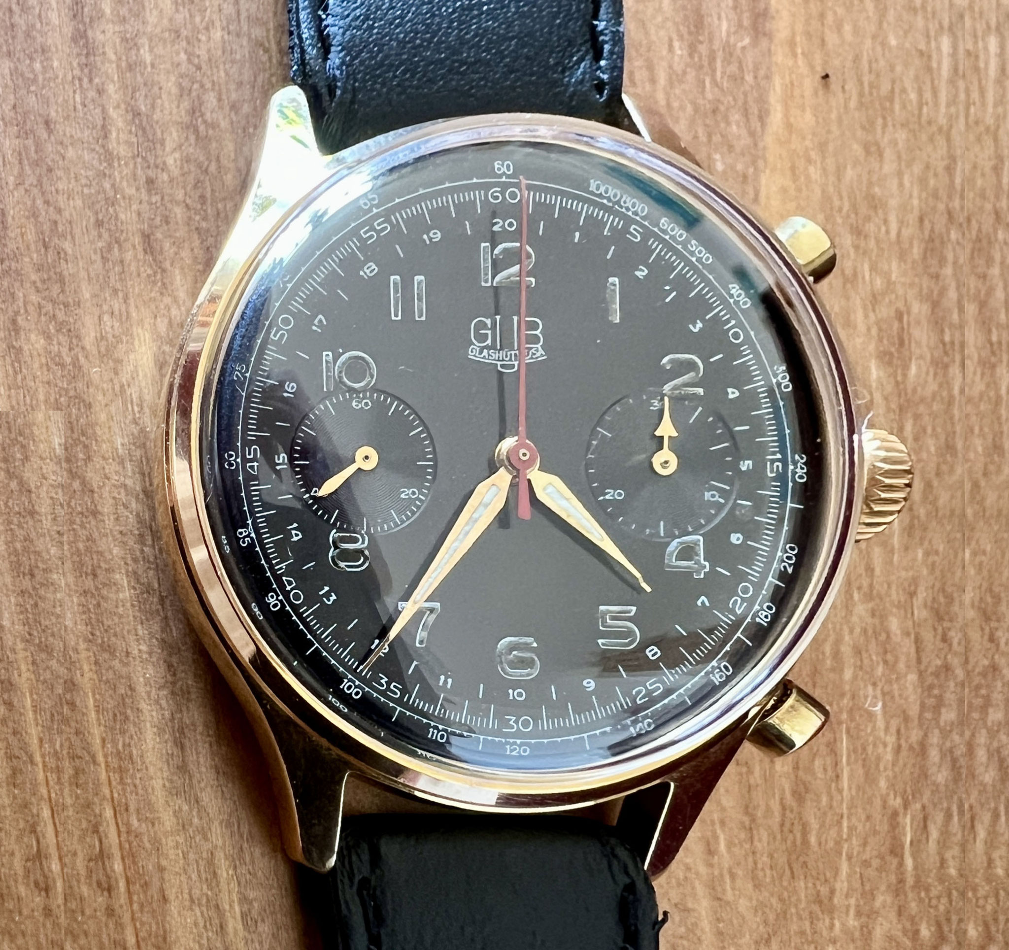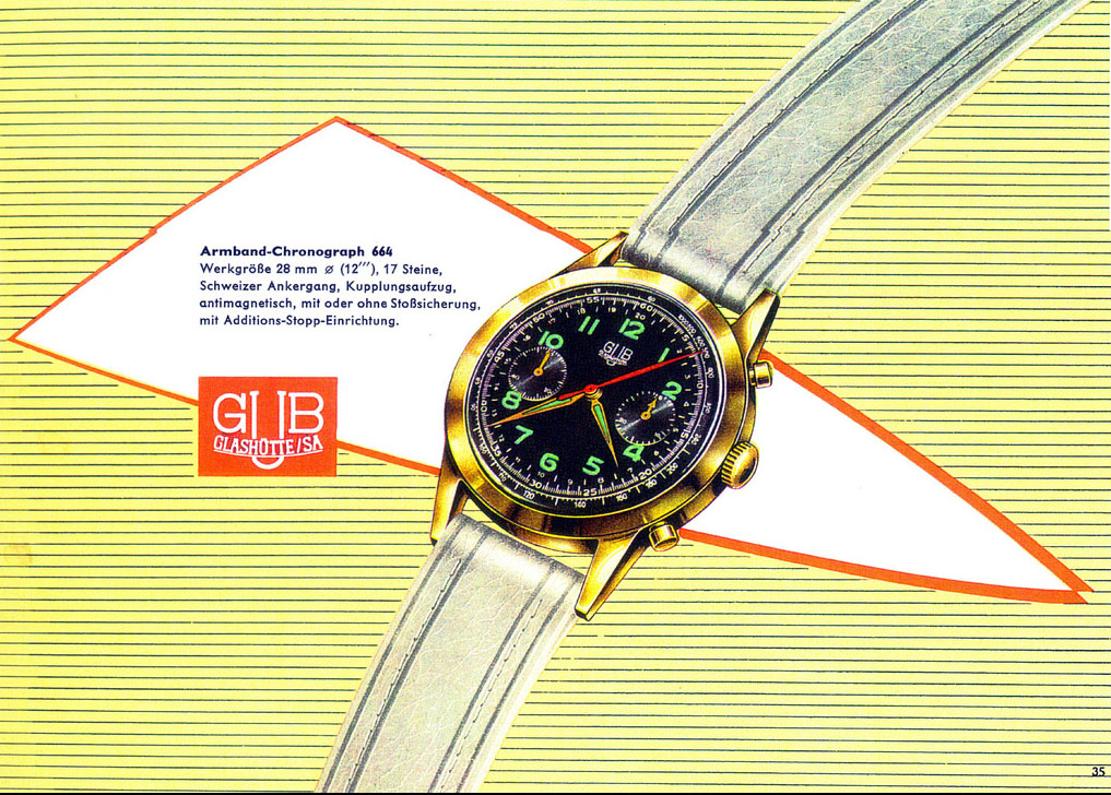 Dieser im Originalzustand erhaltene Schaltradchronograph der Glashütter Uhrenbetriebe mit Schweizer Ankergang, Kupplungsaufzug 17 Steinen und Fly-Back-Funktion wurde in einem aus Frankreich importierten Messinggehäuse mit einem Durchmesser von 35 mm eingeschalt. Das Werk ist die im Wesentlichen baugleiche, auf 28 mm verkleinerte Ausführung des von der UROFA und UFAG von 1941-1945 als Kriegsproduktion gefertigten Tutima Fliegerchronographen Kaliber 59. Im Gegensatz zu diesem wurde das GUB Kaliber 64 nachweislich ausschließlich für den zivilen Gebrauch entwickelt und von 1954-1961 gefertigt. Bekannt sind neben den beiden Werkausführungen mit und ohne Stoßsicherung insgesamt fünf Gehäusevarianten mit 35 bzw. 37 mm Durchmesser und zwei unterschiedlichen Drückergarnituren. Die Messinggehäuse sind verchromt oder mit 20 Mikron Plaqué vergoldet. Acht Zifferblattvarianten mit drei verschiedenen Zeigersätzen vervollständigen das Ausstattungsrepertoire.