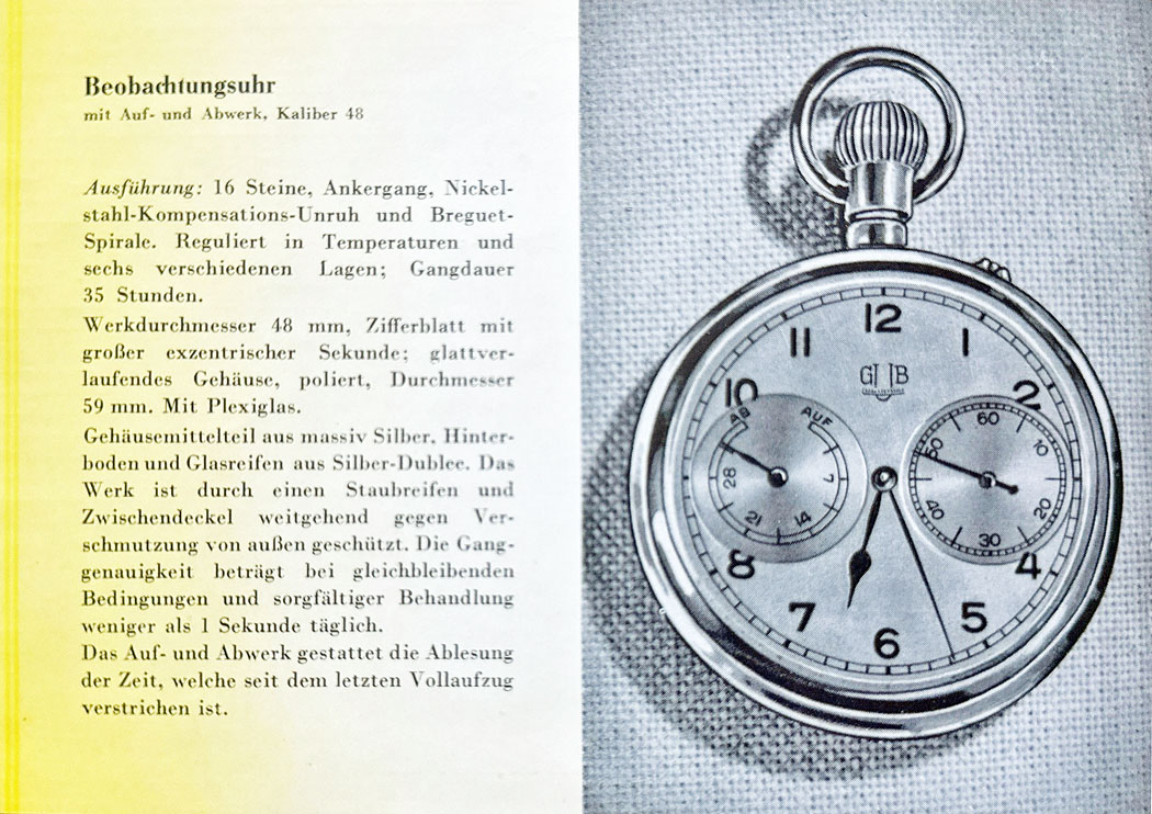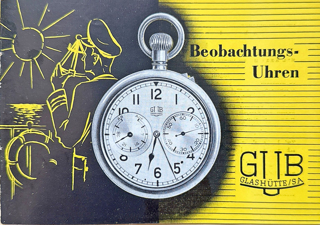 Die hier gezeigte Marine-Beobachtungsuhr ist ein Exemplar, dessen Rohwerk noch von der Firma A. Lange & Söhne gefertigt wurde. Diese Werke sind daran zu erkennen, dass das GUB-Firmenlogo in einer kartuschenähnlichen, ausgefrästen, halbrunden Vertiefung geprägt ist. An der betreffenden Stelle erfolgte die Ausfräsung des zuvor dort befindlichen Firmenlogos von A. Lange & Söhne. Erst im Jahr 1956, nachdem die genannten Werke vollendet und in Betrieb genommen worden waren, begann die GUB mit der Anfertigung eigener Werke.